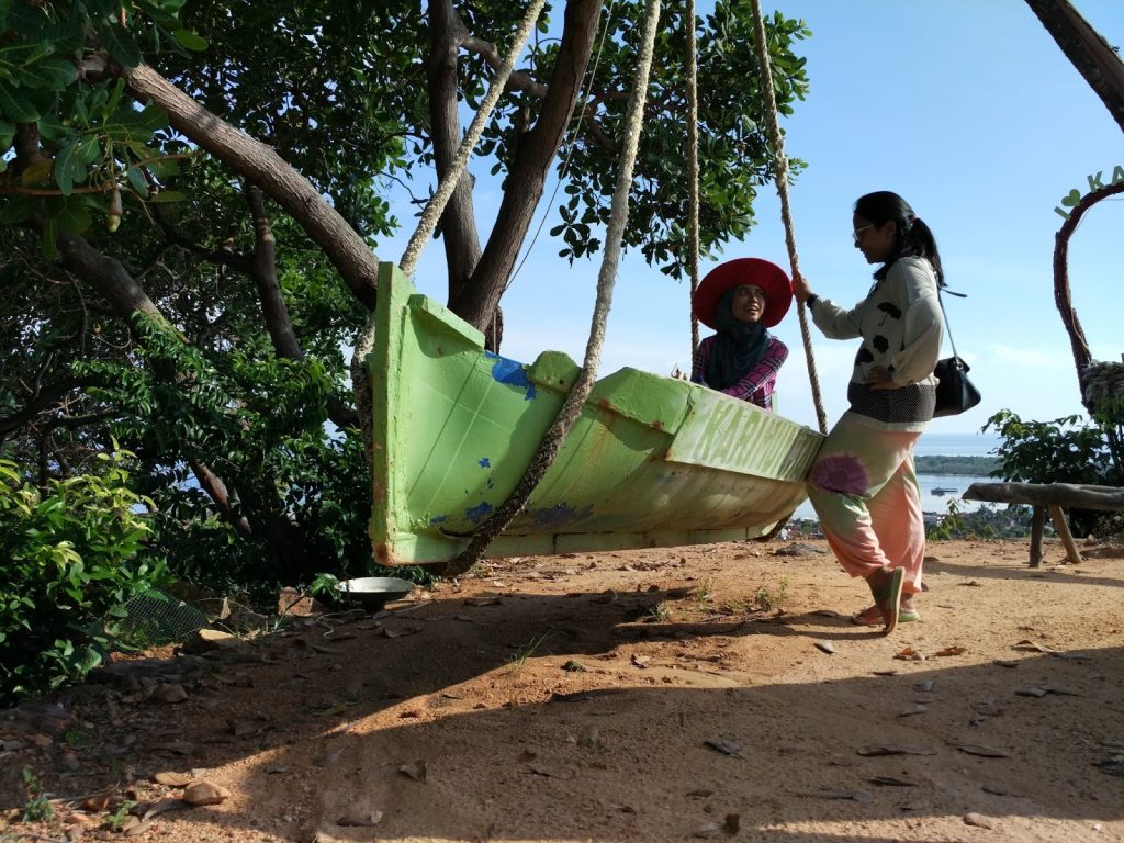 Namanya juga bukit, jadi letaknya di atas. Hegheg. Perjalanan menuju bukit cukup menanjak. Saat itu ada lalu lalang mobil berat yang sedang melakukan pekerjaan sehingga kami parkir di tempat yang lebih rendah, tapi untuk menuju lokasi perlu menaiki tangga-tangga terlebih dahulu. Di Bukit Joko Tuwo ini ada banyak spot-spot buat foto, seperti foto dengan bangkai ikan hiu, naik ayunan kapal, ayunan biasa dengan pohon tak berdaun, tasbih raksasa, sarang burung, bingkai love, dan foto di balkon. Ohya, di bukit ini banyak jambu mete. Kalau Dady dan kakak2ku sih doyan. Aku kurang sreg karena sepet. Highig.