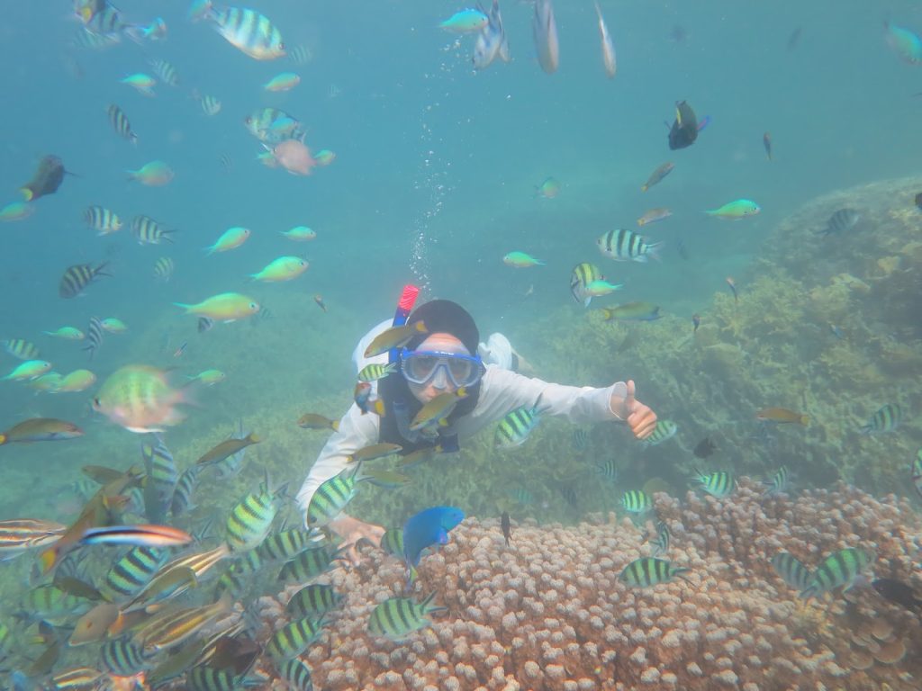 Buat kamu yang masih takut/gak bisa berenang, yakinkan diri bahwa ini kesempatan langka yang bisa kamu alami. Jadi sebisa mungkin sempatkan snorkeling dan berfoto sampai dapat foto yang bagus. 😀